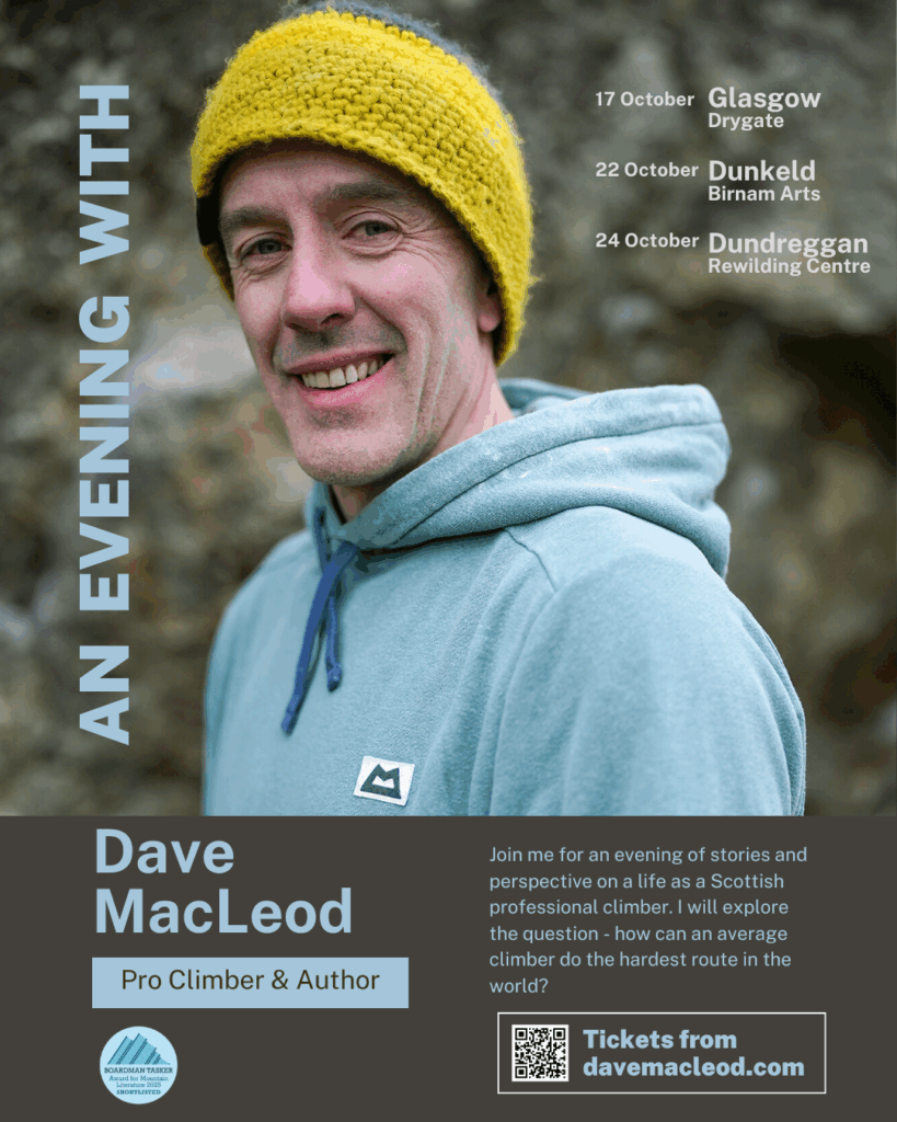 Join Dave Macleod for an evening of stories and perspective on a life as a Scottish professional climber. He’ll explore the question – how can an average climber do the hardest route in the world? The night will end with a Q&A.
